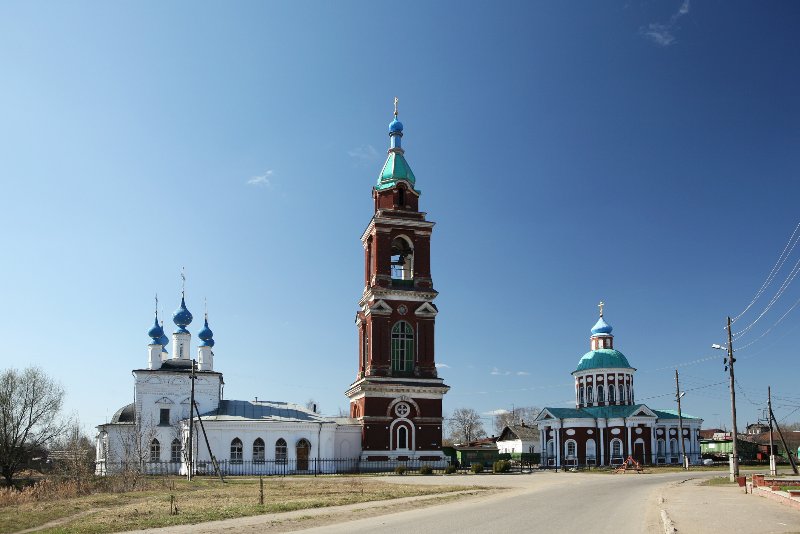 Церковь Святого Никиты Мученика была построена в 1796 году, также прихожанами Покровской церкви. Храм получился очень красивым, изящным и ярким, сейчас в этом ансамбле он привлекает, пожалуй, даже больше внимания, чем более старинная и интересная Покровская церковь. Никитская церковь выстроена в стиле классицизм, с трех сторон входы в нее украшают пышные портики с колоннами. Особенно хорош высокий барабан с рядом узких и высоких окон, обеспечивающих превосходное освещение храма. Барабан увенчан небольшим куполом, живописно дополняющим весь облик храма и придающим ему устремленность ввысь. В советское время храмы еще долго оставались действующими. Но в 1941 году было принято решение об их закрытии, и в красивых зданиях расположилась автостанция и авторемонтная мастерская. Снова богослужения начались в Никитском храме только в 1988 году, и с этого момента красивый комплекс стал возрождаться к жизни. Сейчас трудно себе представить, что два десятка лет назад здесь были мастерские. С колокольни на весь город слышен звон, а отражение храмов в гладкой воде Колокши заставляют остановиться любого, даже самого искушенного путешественника.
