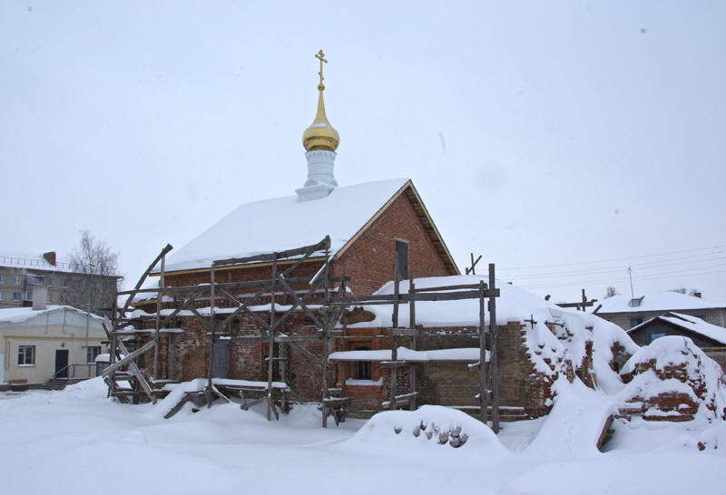 Юрьев-Польский. Церкви Рождества Христова и Бориса и Глеба Церковь Рождества Христова была построена в начале XVIII века на месте прежней деревянной. Переулок, в котором стоял храм, назывался Кокушкиным и Козьмодемьянским. Последнее название он получил от храма, который местные жители знали больше как Космодамианский, по посвящению одного из приделов. Есть предположение, что первоначально весь храм был освящен в честь Космы и Дамиана, и только в конце XVIII века, после пристройки колокольни был переосвящен во имя Рождества Христова. Приделы в храме были посвящены Параскеве Пятнице и святым Козьме и Дамиану. Это была летняя, или «холодная» церковь – сравнительно невысокий четверик, увенчанный пятью большими барабанами с луковичными главами. К четверику была пристроена низенькая трапезная с трехъярусной массивной колокольней, на которой были даже часы. Колокольня не сохранилась, она была полностью разрушена в советское время. Четверик храма украшают ложные закомары в верхней части, а все фасады разделены небольшими лопатками на три части. И без того высокие барабаны приподняты за счет окружающих каждый барабан кокошников.